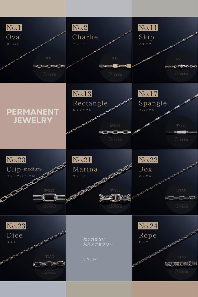取り扱いしているチェーンも素材、形さまざまなものをご用意しております。